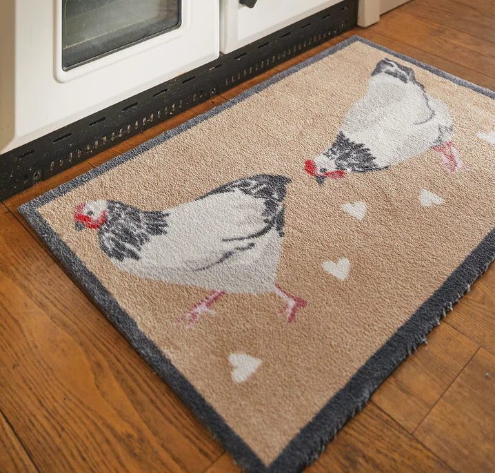 Eco-friendly, cotton washable mats. Ideal for putting by your doorway to trap dirt and protect your floors, whilst adding some style and colour to your home. Part of our country collection, Chicken 1 has been inspired by the British countryside. This mat design features 1 grey and white chicken pecking at white hearts, on a beige background, with a grey border. Hug Rugs are designed to trap up to 95% of dirt, dust and mud, are ultra-absorbent, and manufactured in the UK from up to 90% recycled materials. They are washable at 30 degrees, and also have a non-slip rubber backing, to keep them securely in place.
