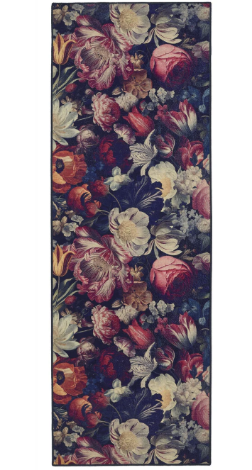 Our Dark Florals Rug is from our Signature collection, taking inspiration from beautifully hand painted and drawn florals. This design is made up of photography style oversized floral blooms and is like a piece of artwork for your floor and will instantly elevate your interior design, from living rooms to bedrooms it would suit all areas of the home. In deep shades of red, cream, orange and pinks with a dark navy background. Finished with navy tape. It is normal for the design to show speckles of the white from the yarn, and gives all the designs a classic, vintage look. Pile Height: 5mm
