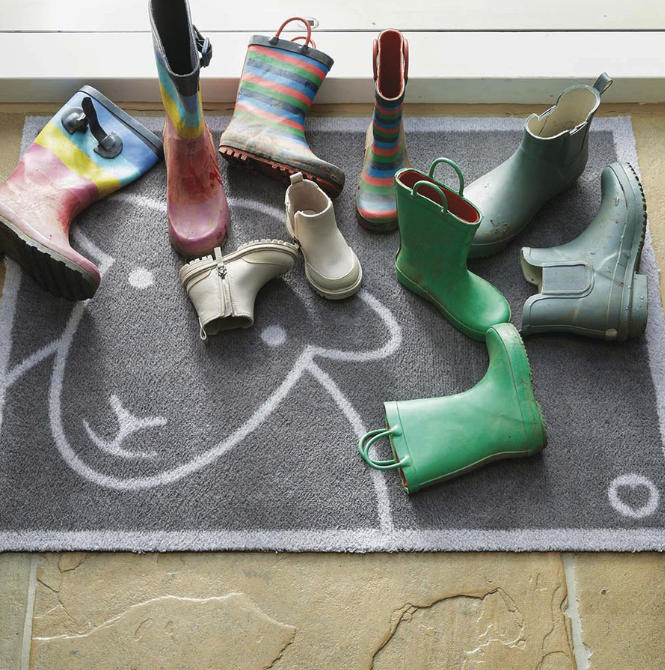 Eco-friendly, cotton washable mats. Ideal for putting by your doorway to trap dirt and protect your floors, whilst adding some style and colour to your home. The Hello Grey design is part of our collaboration with Herdy, has a dark grey background, with a light grey Herdy head outline in the corner, and a light grey border. Hug Rugs are designed to trap up to 95% of dirt, dust and mud, are ultra-absorbent, and manufactured in the UK from up to 90% recycled materials. They are washable at 30 degrees, and also have a non-slip rubber backing, to keep them securely in place.