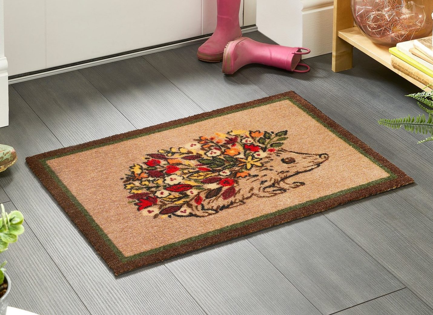 All-purpose indoor mat, that is highly effective at keeping your floors clean. My Mat Nylon Floral Hedgehog features a hedgehog with floral quills in shades of red, orange, and dark green on a beige background. It has a thin green inner border, and a brown thicker outer border. This range of brilliant designs and sizes provides easy cleaning and drying properties. With natural stain resistance, My Mats maintain freshness after continuous washes and uses. Traps dirt, dust & mud to protect your flooring and washable at 30°C.