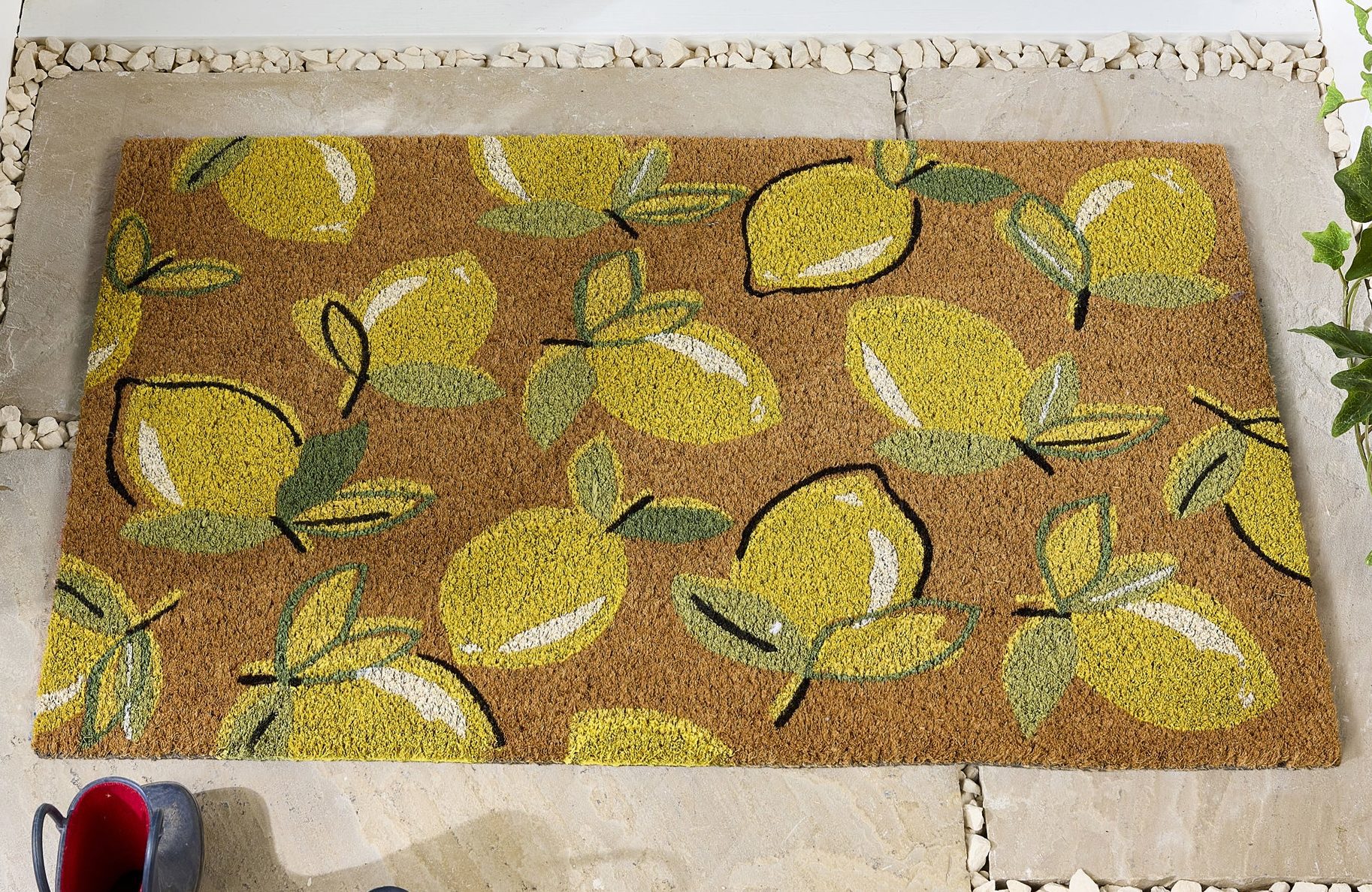 Expertly crafted from natural materials, My Coir Mat is the perfect welcome to any doorway. The hard-wearing natural coconut husk fibres remove dirt, dust and mud at the door, while looking great and being an eco-friendly choice. The Lemons design features multidirectional pattern of bright yellow lemons with green leaves and black outlines. The natural coconut husk fibres remove muck at the door, while looking great and being an eco-friendly choice.